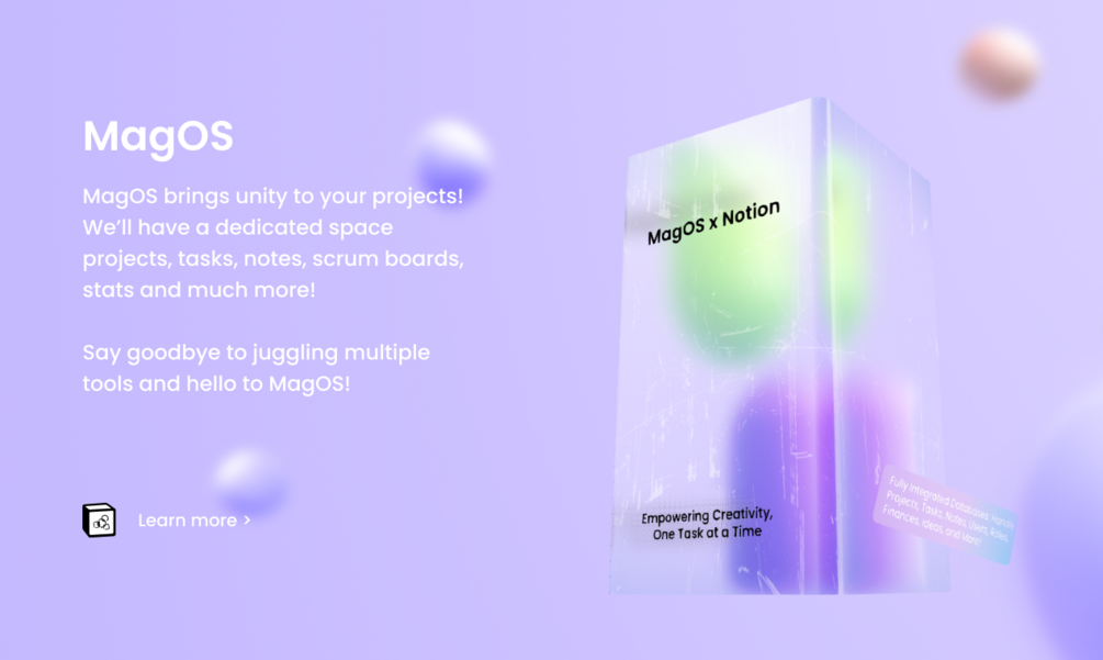 If you've been grappling with integrating multiple templates from various creators to customize your Notion workflow, your journey ends here. MagOS is your all-in-one Notion template. It integrates all the essential project management and tracking systems you need on a day-to-day basis to save time, boost productivity, and most importantly, foster a sense of tranquility in your team.